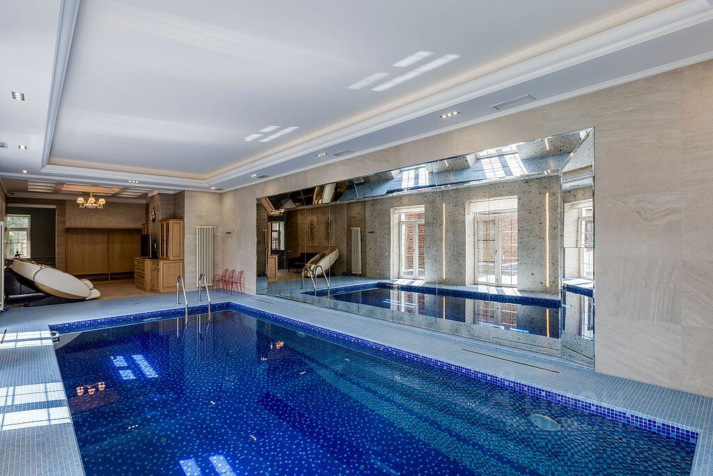 1 этаж: холл с гардеробной, гостевой с/у, кухня-столовая, гостиная, кабинет, комната для занятий, каминная комната, гостевая комната, СПА-зона: бассейн (12х4 м), сауна, с/у, душевые, помещение для барбекю с отдельным входом