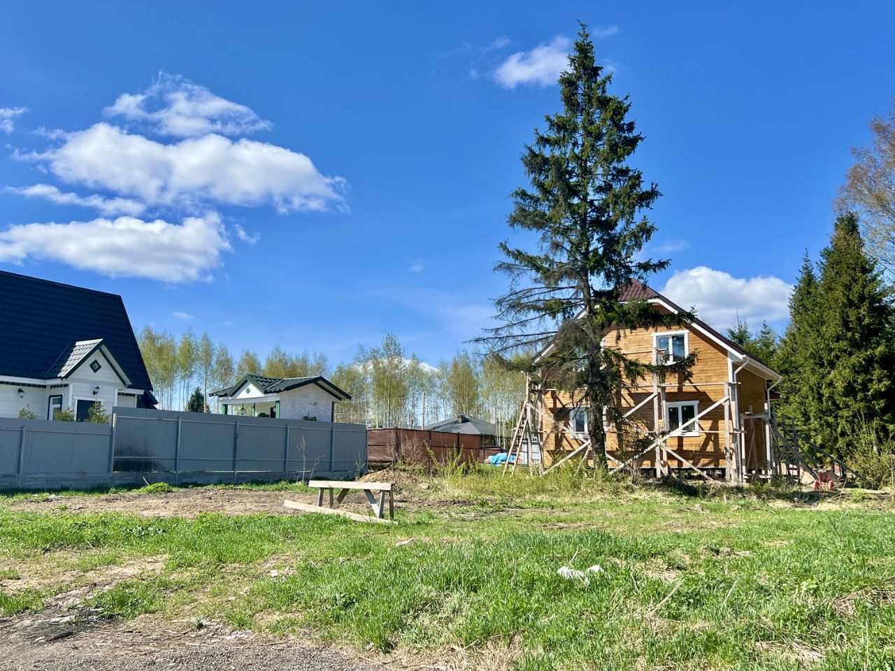 Участок прямоугольной формы, с высокой елью, рядом с благоустроенным прудом и выходом в лес!