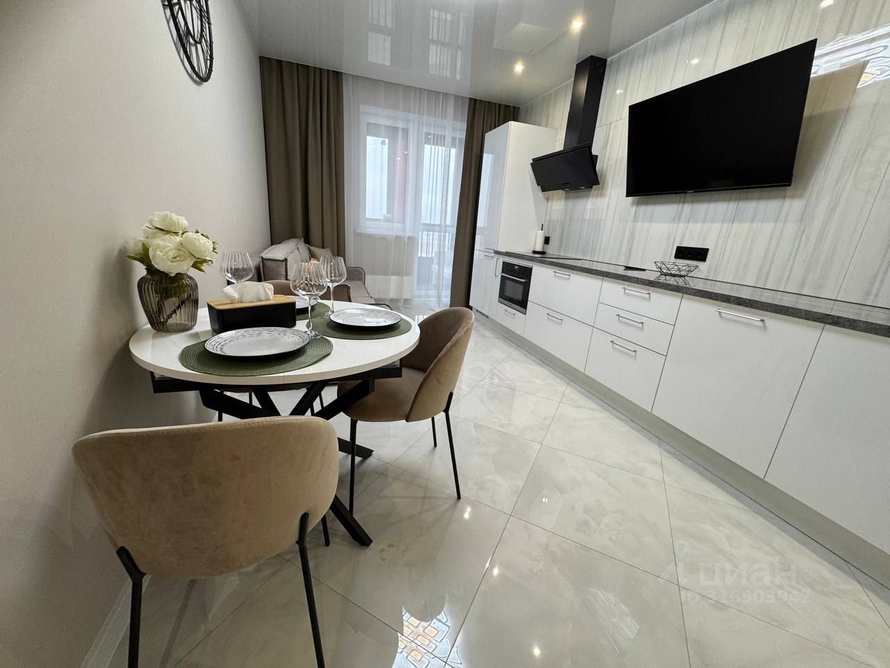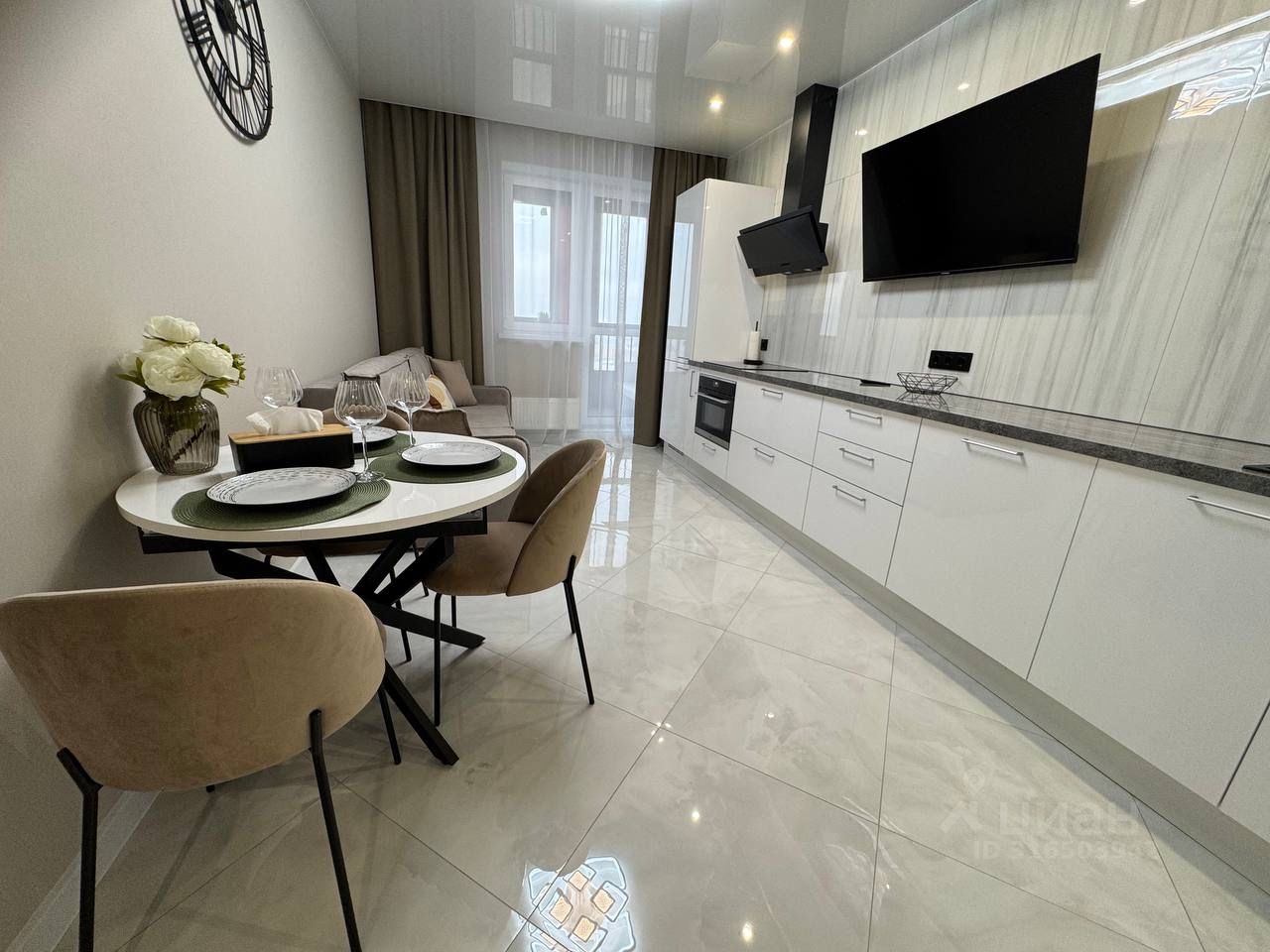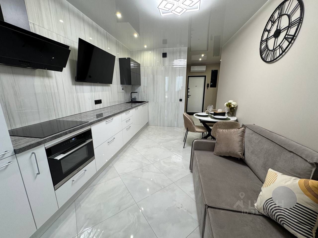 Новые шкафы - купе, встроенная кухня и техника( индукционная плита, вытяжка, посудомоечная машина , кондиционер, телевизор, встроенный холодильник).