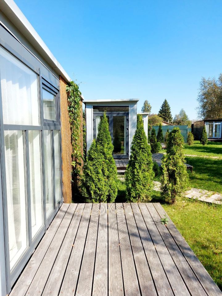 В доме 1 этаж, 1 комната. Панорамные окна. Санузел в доме. Установлена душевая кабина. Стиральной машины нет. Отопление электрическое.