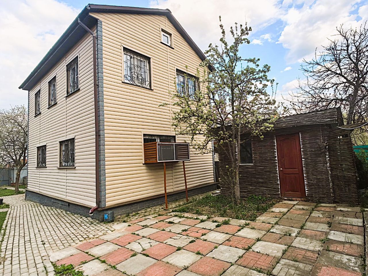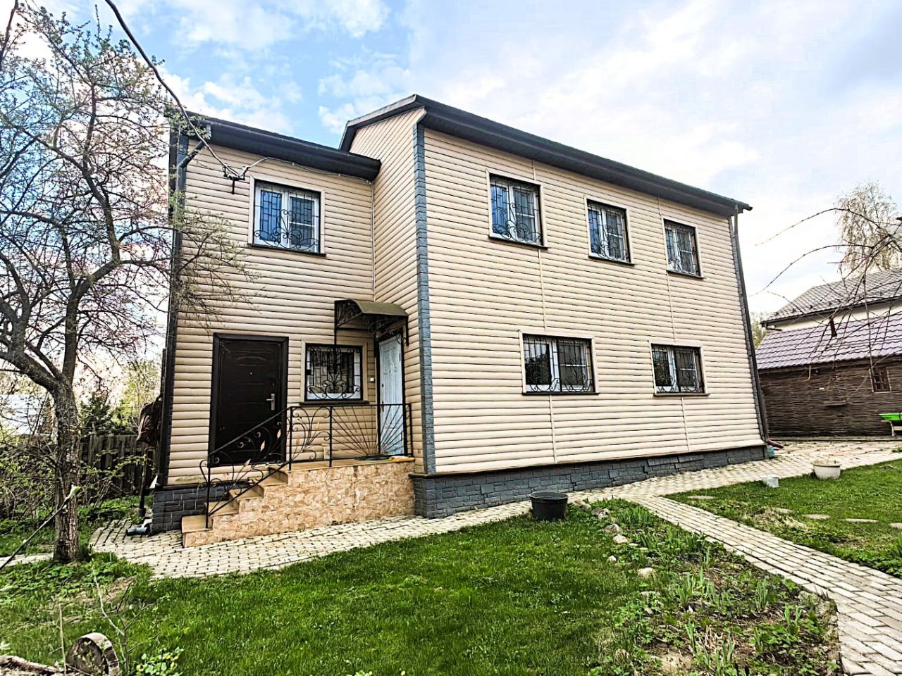 Второй дом из бруса, облицован сайдингом, цоколь облицован керамогранитом.