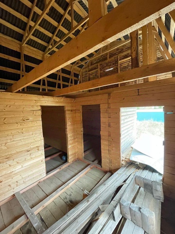 На участке имеется недостроенный дом с параметрами: 6х6 метров, 72м2. Фундамент: сваи винтовые, Металлические 11 штук, D = 108 мм, L = 2500 мм с антикоррозийным покрытием. Профилированный брус хвойной породы, сечением 95х145 мм. Высота потолка: 1 этаж - 2,30м, (17 венцов), 2 этаж - 2,30м. Перегородки: 1-й этаж - брусовые.
