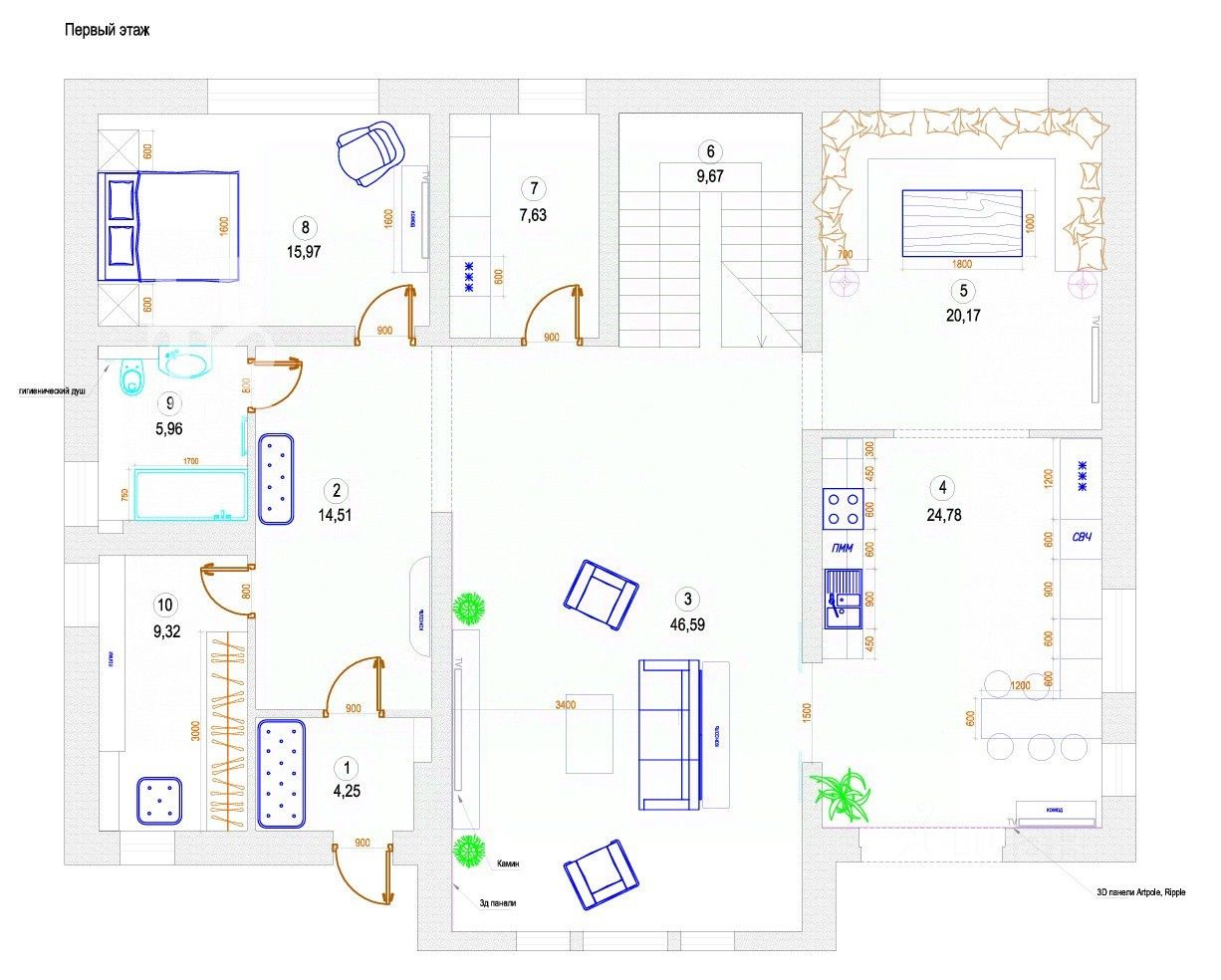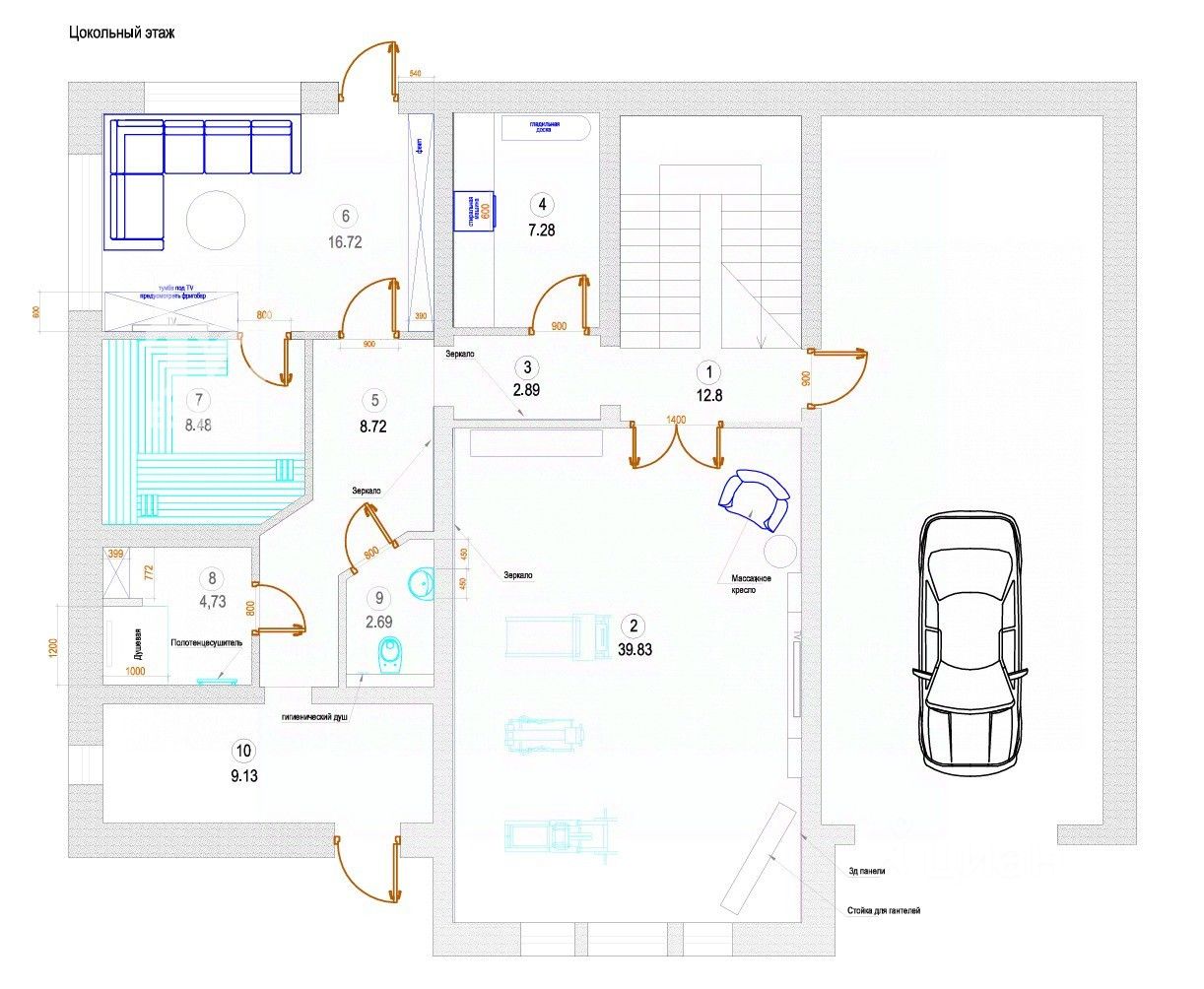 Первый этаж: прихожая, холл, гостиная, кухня с выходом на террасу, столовая, кладовая, гостевая спальня, гостевой санузел, гардеробная Второй этаж: мастер-спальня с собственным санузлом и гардеробной, спальня с гардеробом, кабинет, лестничный холл, спальня, санузел Цокольный этаж: спортивный зал, постирочная, сауна, комната отдыха, душевая, санузел, бойлерная, гараж на 2 м/м
