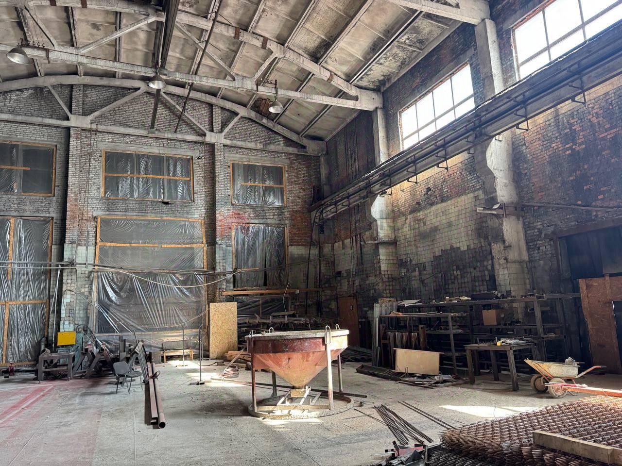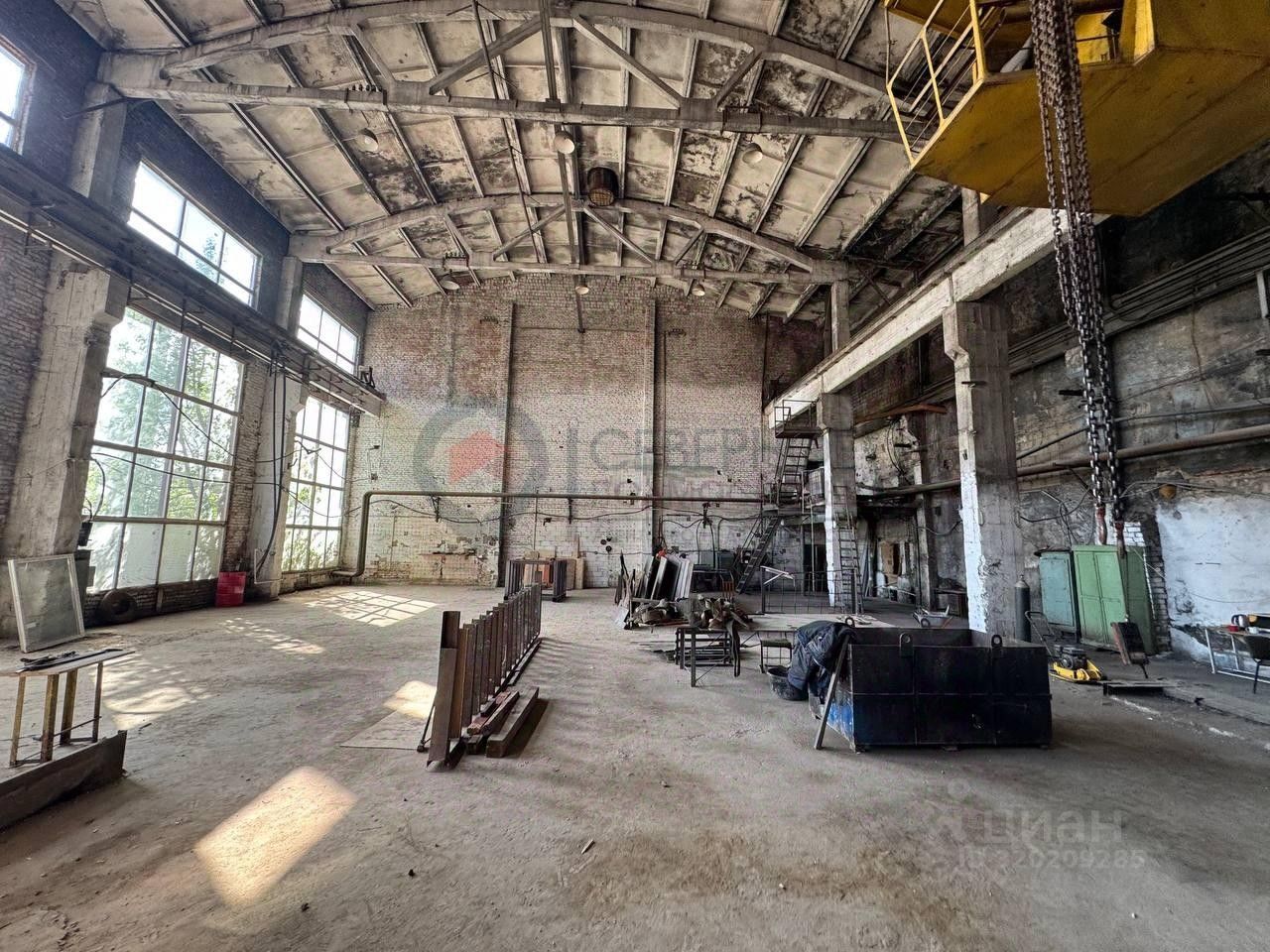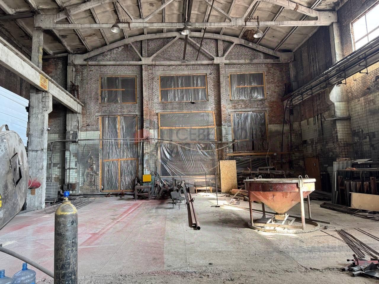 Технические характеристики: Высота потолков: 10 до 12 метров. Ширина здания:18 метров. Пол: Бетон Кран-балка 5 т. Мокрая точка