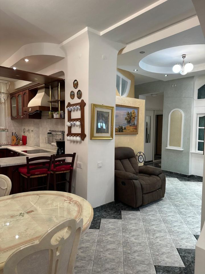 Продаётся большая, шикарная квартира (евро-трёшка) с панорамным видом на парк по адресу Московская обл., г. Королев, ул. Циолковского, д. 14/16, в кирпичном доме Сталинка в самом центре г. Королев Московской области в благоустроенном районе, с отличной планировкой, на втором этаже пятиэтажного дома, высота потолков 3 метра. Площадью 92,3 (97) кв. метров с индивидуальным архитектурным решением, двумя эркерами, что дает больше света и уюта. Сделан шикарный качественный ремонт, пол с подогревом, окна со стеклопакетами, кондиционер, видеодомофон, зону гостиной и кабинета разделяет столешница и камин из редкого мрамора. Кровать спальни находится в нише, что придает уют и спокойствие во время отдыха! В квартире имеется Итальянская мебель: спальня, кухня фабрики (Томасси) из массива дуба со встроенной техникой, гардеробная. Объединение кухни и столовой позволяет увеличить пространство. Во дворе зеленый газон, удобные парковки, детсад, рядом 2 школы, парк, Дворец культуры им. Калинина с концертным залом, музыкальная школа, магазины, автобусная остановка (20 минут до метро ВДнХ), в 5 минутах поликлиника, больница, жд. станция Подлипки. Один взрослый собственник.