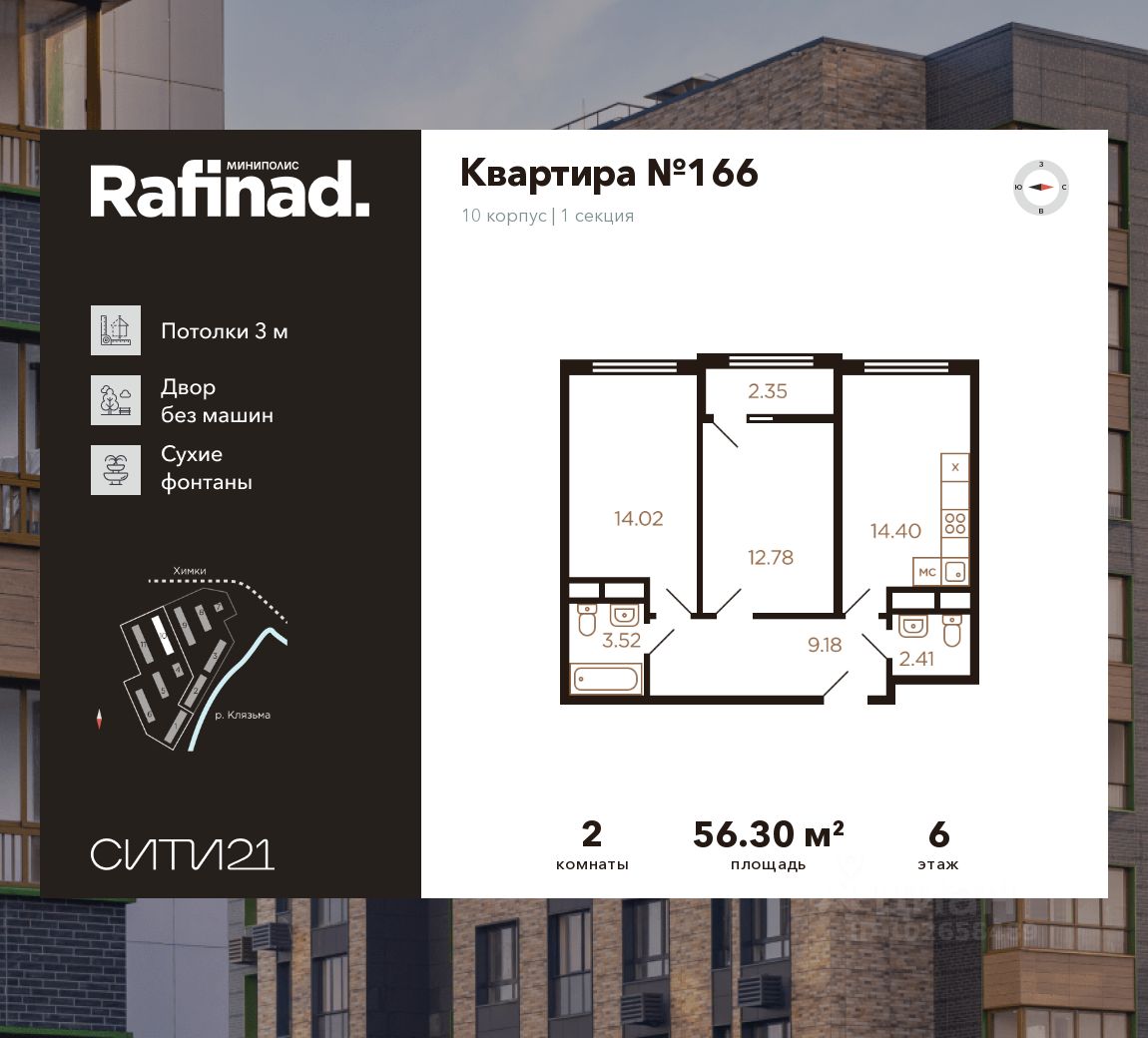 Продаётся 2-комнатная квартира общей площадью 56.30 м² на 6 этаже.