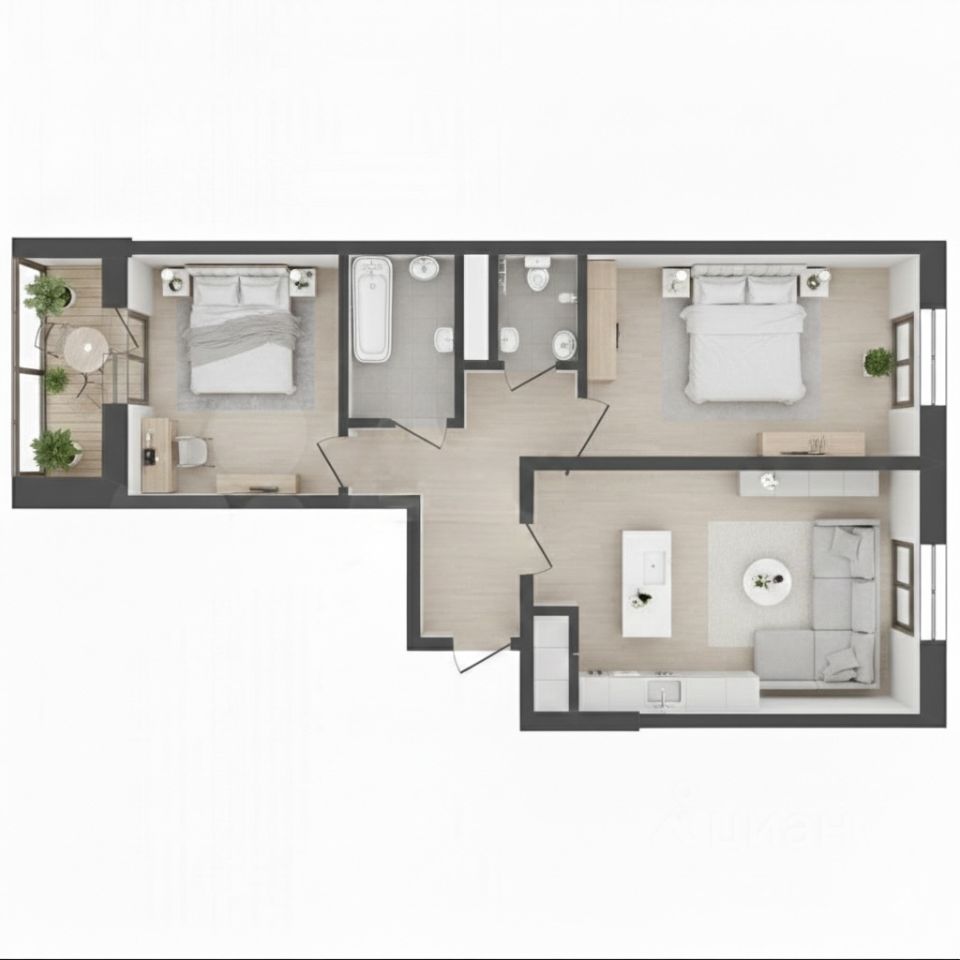 Общая площадь квартиры, с учетом лоджии - 65 кв.м., изолированные комнаты - 16 и 14 кв.м., просторная кухня-гостиная - 18 кв.м., санузел раздельный.